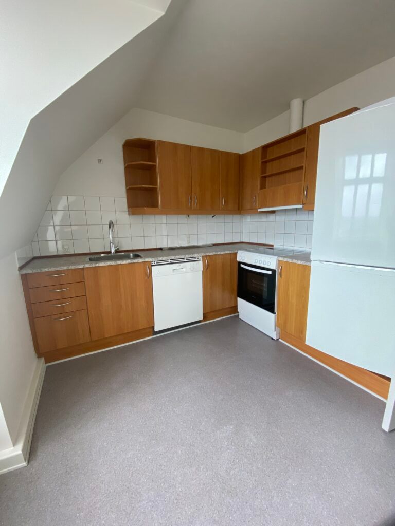 Lejligheden består af et pænt og velholdt køkken med opvaskemaskine og god plads til spiseområde. Køkkenet har desuden en hyggelig karnap, som giver et dejligt lysindfald. Badeværelset er af god størrelse med bruseområde og praktisk opbevaringsplads på den ene væg.