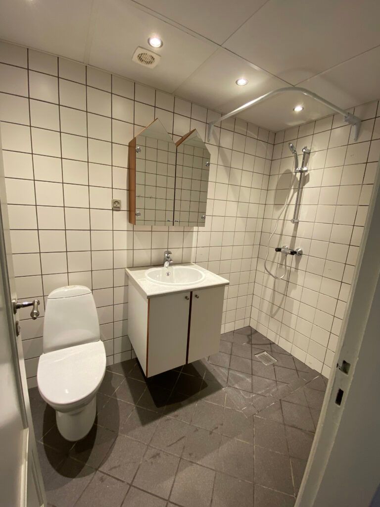 Køkkenet er pænt og velholdt med god skabsplads, opvaskemaskine og plads til en lille spiseplads. Fra køkkenet er der udgang til altan. Badeværelset/toilettet er rummeligt med bruseniche, opbevaringsmuligheder og gulvplads til eksempelvis en reol.