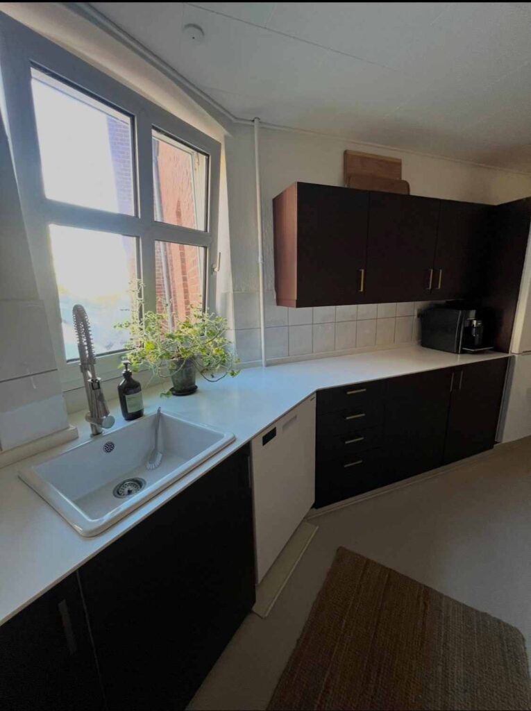 Lejligheden byder på et dejligt stort og moderne køkken med mulighed for at indrette hyggeligt spiseområde. Køkkenet fremstår stilrent med flot porcelænsvask og smart armatur med fleksibel vandhane. Der er opvaskemaskine samt alle øvrige hårde hvidevarer – og som en ekstra bonus medfølger både vaskemaskine og tørretumbler.