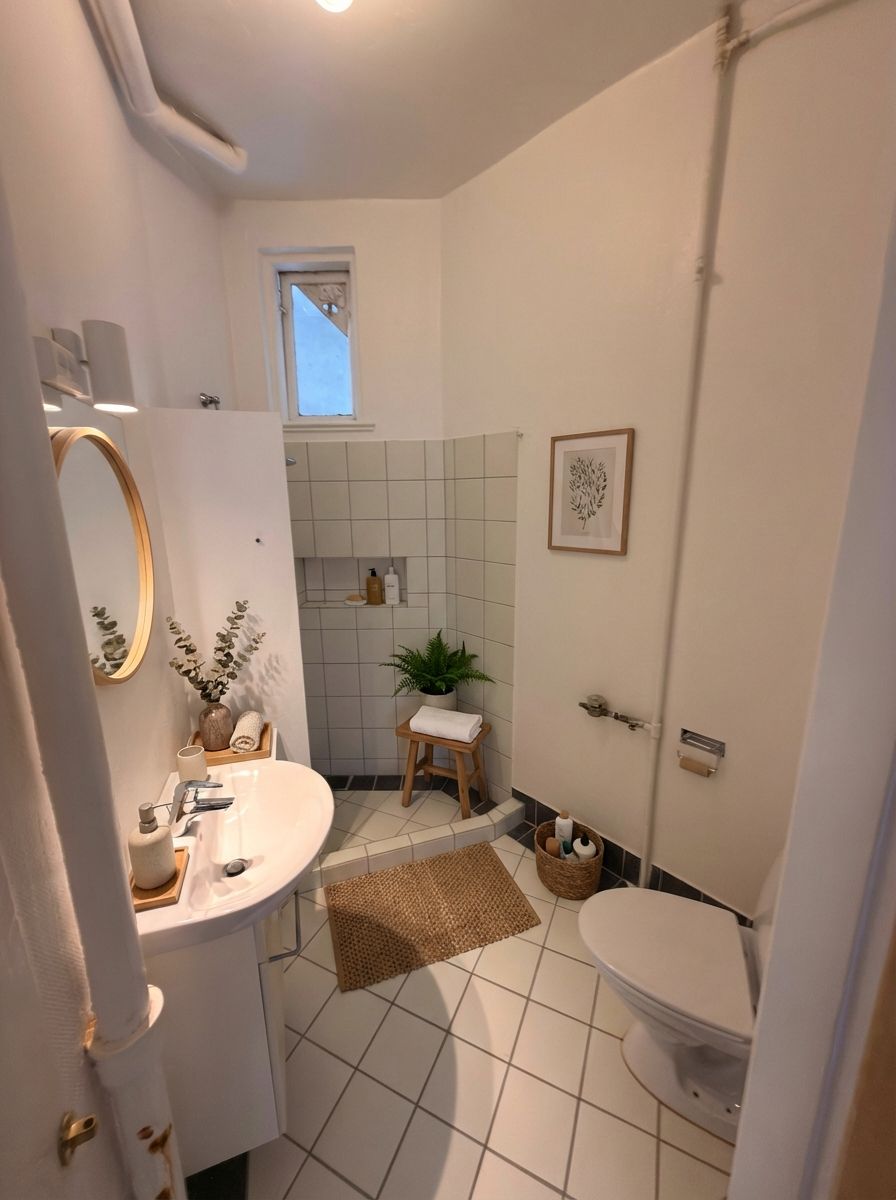 Badeværelset fremstår lyst og velholdt med fliser, separat brusezone og et lille vindue,