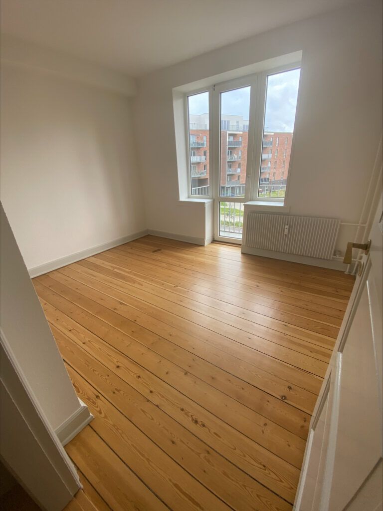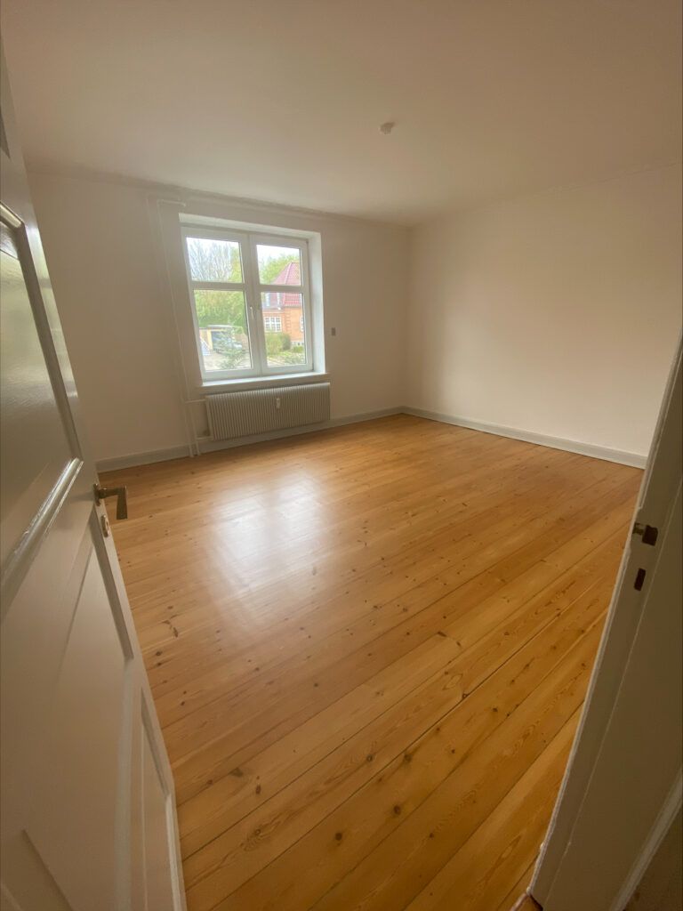 Både stue, værelse og gang har pæne trægulve, som bidrager til lejlighedens varme og indbydende atmosfære.