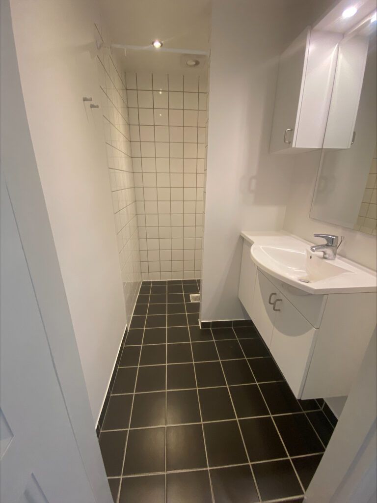 Lejligheden har separat bad og toilet. Toilettet er opdateret med væghængt toilet, moderne klinker på gulvet og nyere vask. Badeværelset er holdt i samme stil med samme moderne klinker på gulvet, har bruseniche og et større bademiljø med skabe under vasken samt vægskab. Begge rum har indbyggede spots i loftet, som giver et sammenhængende, flot og moderne udtryk.