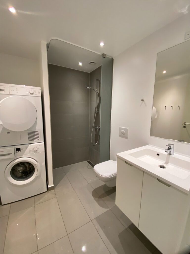 Badeværelset er rummeligt og moderne indrettet med indbyggede spots i loftet, væghængt toilet, pænt bademiljø med god opbevaringsplads samt separat bruseniche. Her findes også en praktisk vaskesøjle med vaskemaskine og tørretumbler.