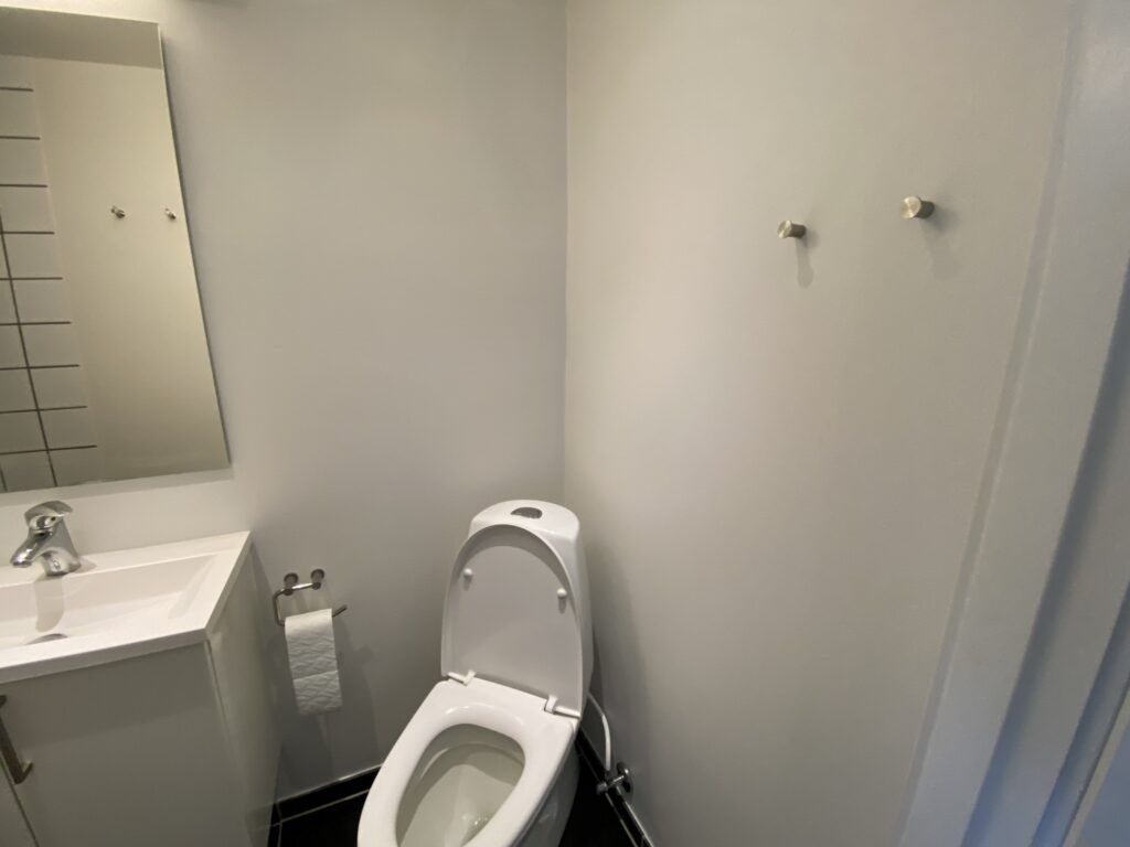 Stuen er rummelig og lys med et stort vinduesparti og direkte udgang til egen altan. Værelset har en god størrelse, dejligt lysindfald og deler det samme flotte trægulv som stuen. Entréen/førergangen fremstår indbydende med indbyggede spots i loftet, som skaber et moderne og behageligt lys.