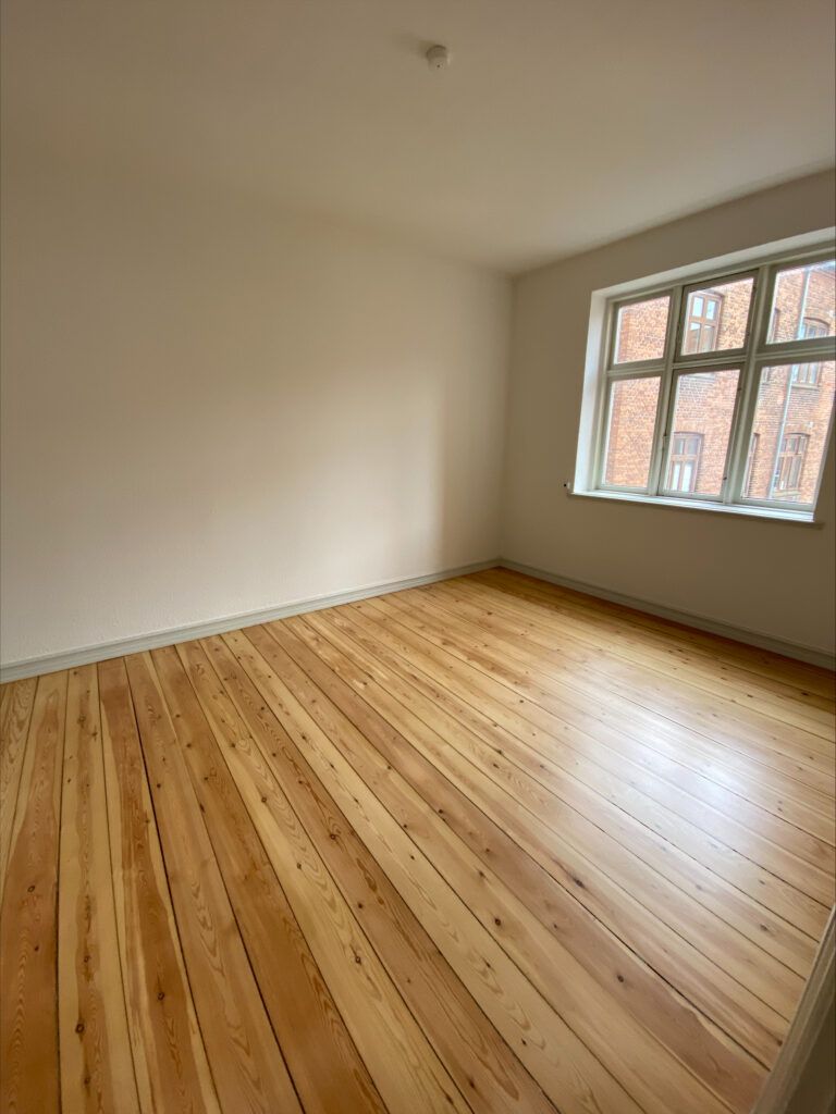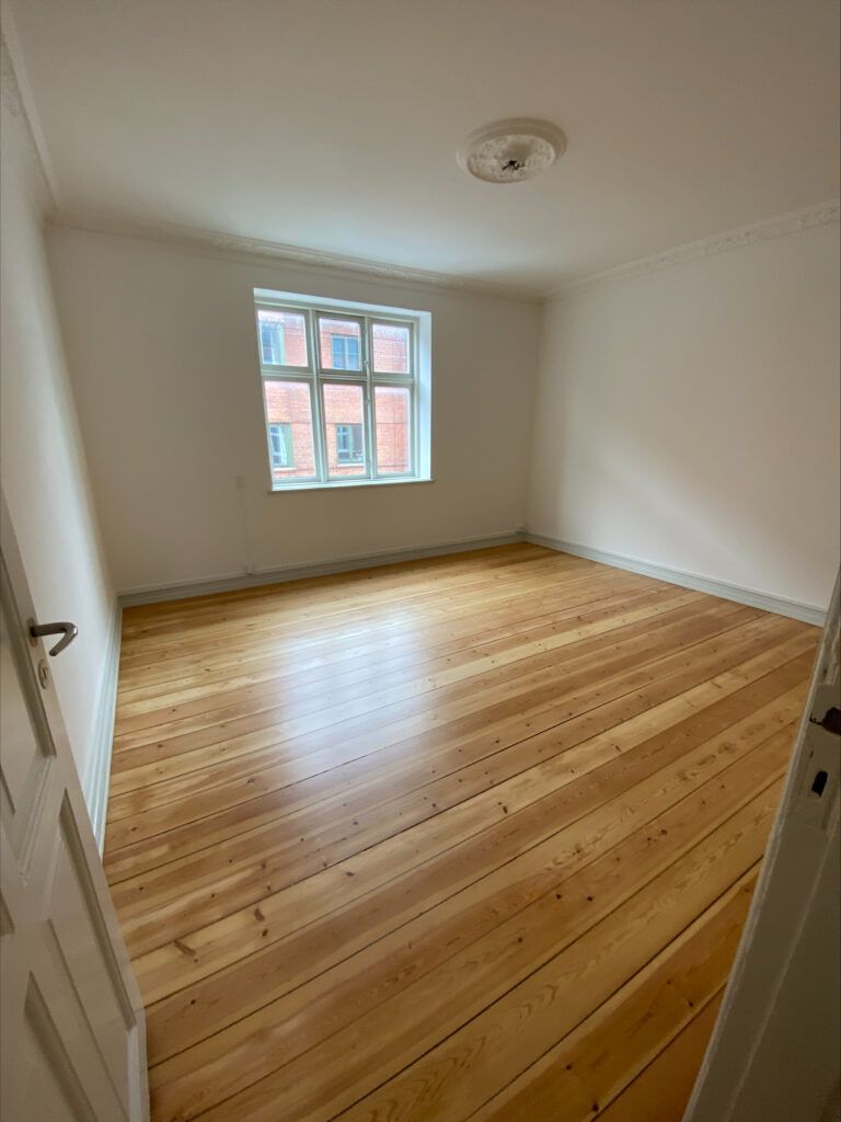 Stuen fremstår lys og indbydende med et stort vinduesparti, pænt trægulv og flot stuk langs loftskanten samt dekorativ loftroset, som tilfører lejligheden charme og karakter. Værelset har en god størrelse med fint lysindfald og ligeledes pænt trægulv.